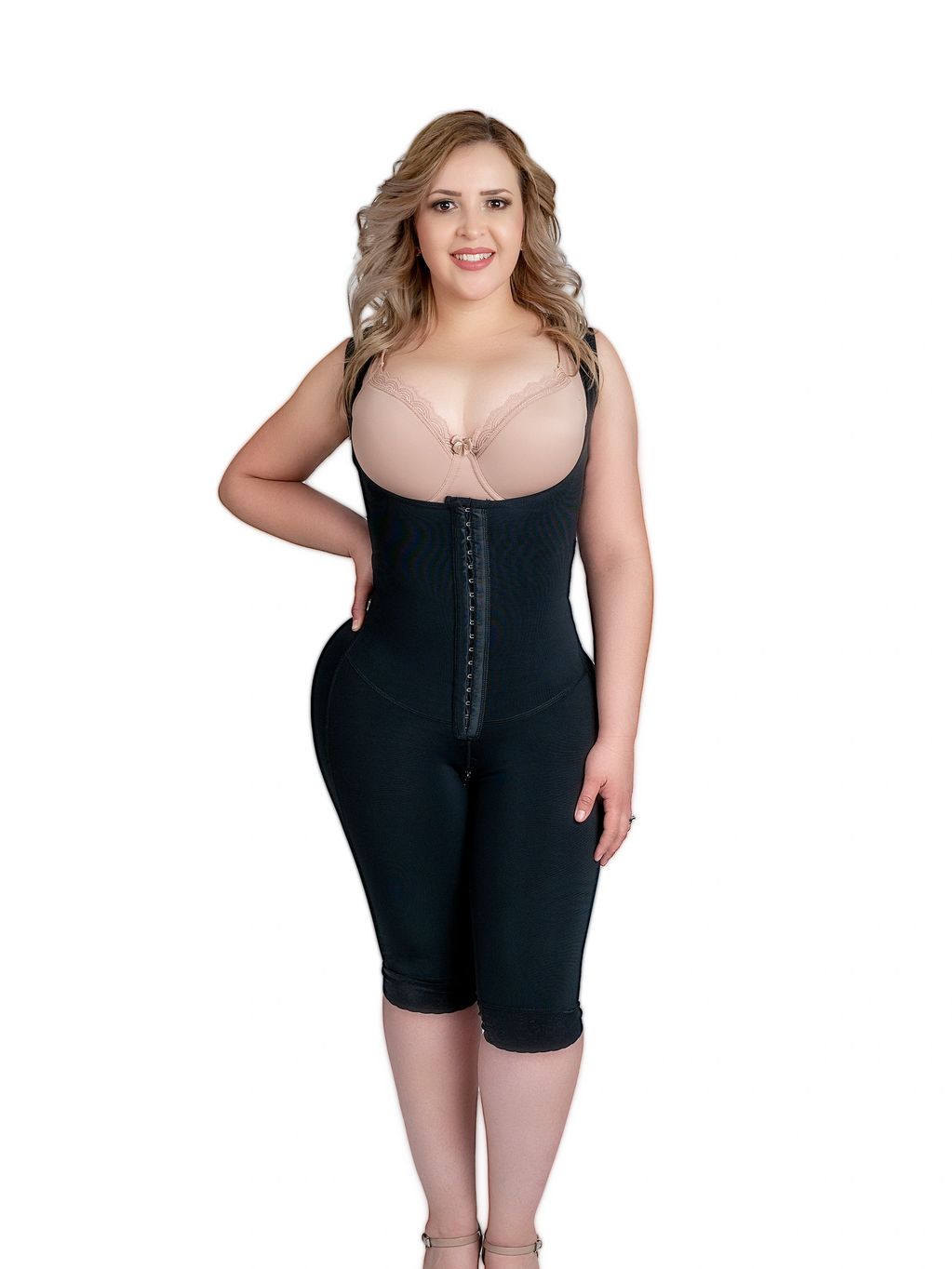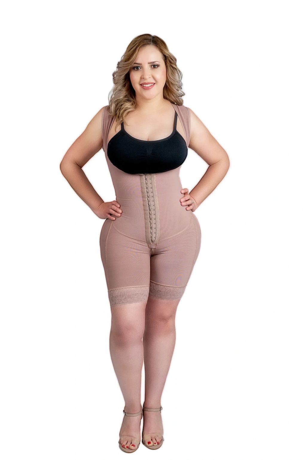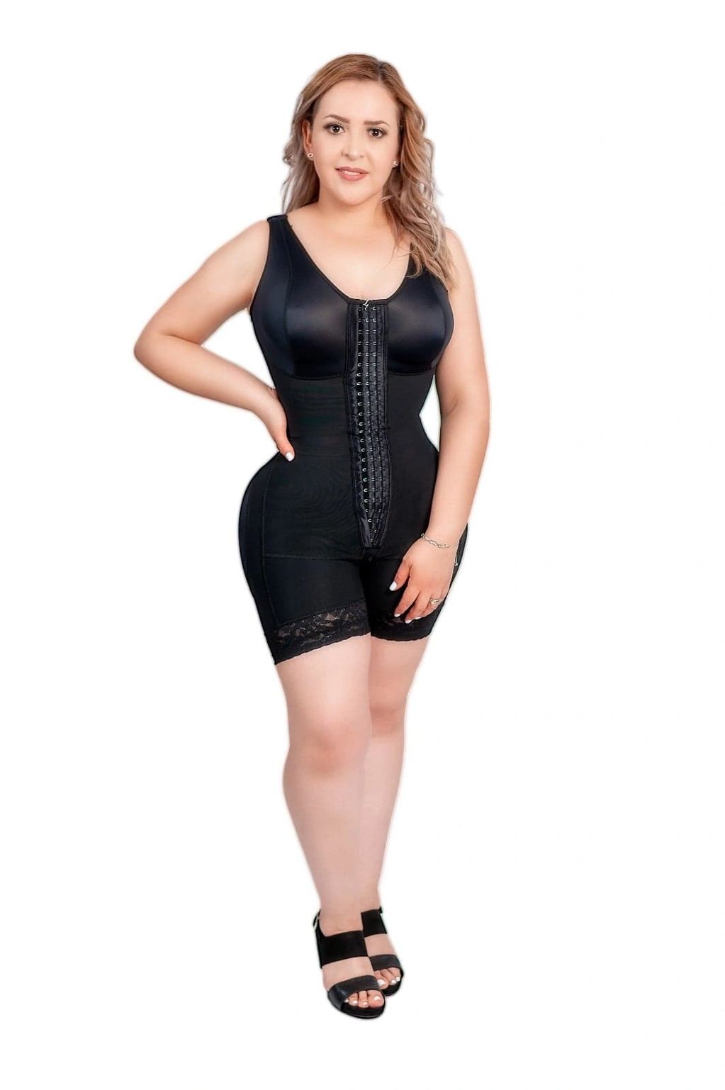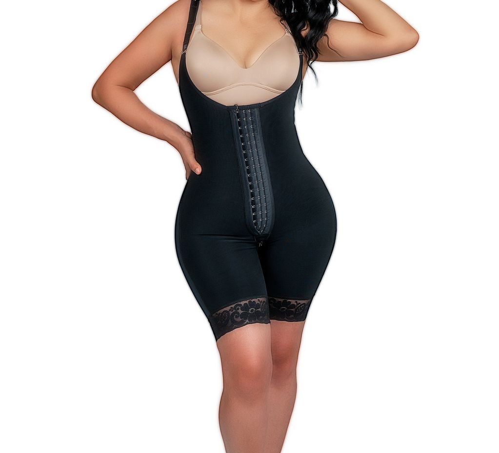 Faja Colombiana primera, segunda y tercera etapa de media pierna con encaje siliconado que se adhiere a la piel y evita que se enrolle. Faja con espalda alta para mejor soporte de espalda y mejor postura. Tirante ancho que ayuda a quitar los rollitos de la espalda. Ayuda al levantamiento de glúteos. Cuenta con tres opciones de broche frontal y cierre en la parte intima con una tela suave por dentr